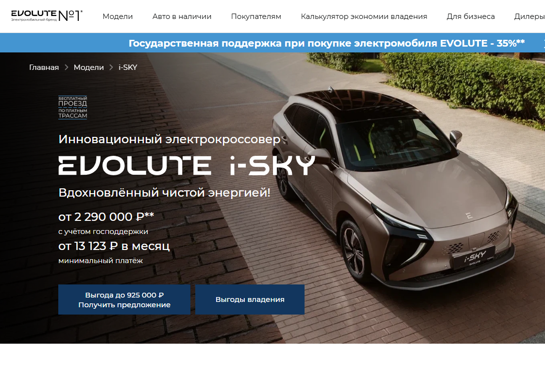 Благодаря локализации сборки в Липецке, на Evolute i-Sky распространяется программа льготного автокредитования. Это означает, что фактическая цена для покупателя может быть значительно ниже: